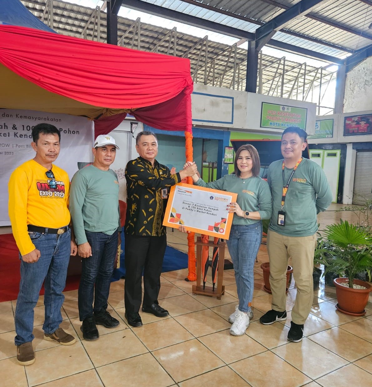 Penyerahan pohon dan kontainer secara simbolis dilakukan oleh Area Manager Danamon Region Sulampua, Merlin Maya Lumangkun kepada PJ Walikota Kendari yang diwakili oleh Staf Ahli Bidang Ekonomi, Muhammad Saiful, ST, MT, dan disaksikan oleh Kadis Perdagangan Koperasi dan UKM Kota Kendari, Alda Kesutan Lapae, S.Si, dan Sekretaris Dinas Perdagangan Koperasi dan UKM Kota Kendari, Drs Jabar, ST., di Paddy’s Market, Sabtu (2/12/2023).