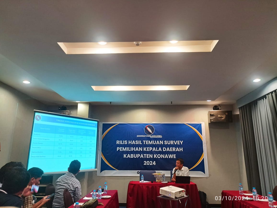 Direktur Lembaga Survei Jaringan Suara Indonesia, Popon Lingga Geni menjelaskan bahwa hasil survei yang dilakukan kepada masyarakat Konawe dengan pertanyaan, bahwa apabila pemilihan dilakukan hari ini, maka dari ketiga calon siapa yang mereka pilih. Lalu, berdasarkan survei yang dilakukan secara acak tersebut, hasil sementara tertinggi diperoleh pasangan calonĀ nomor urut 2, Rusdianto – Fachry Pahlevi Konggoasa (RD-FPK) dengan presentasiĀ 44,1 persen.