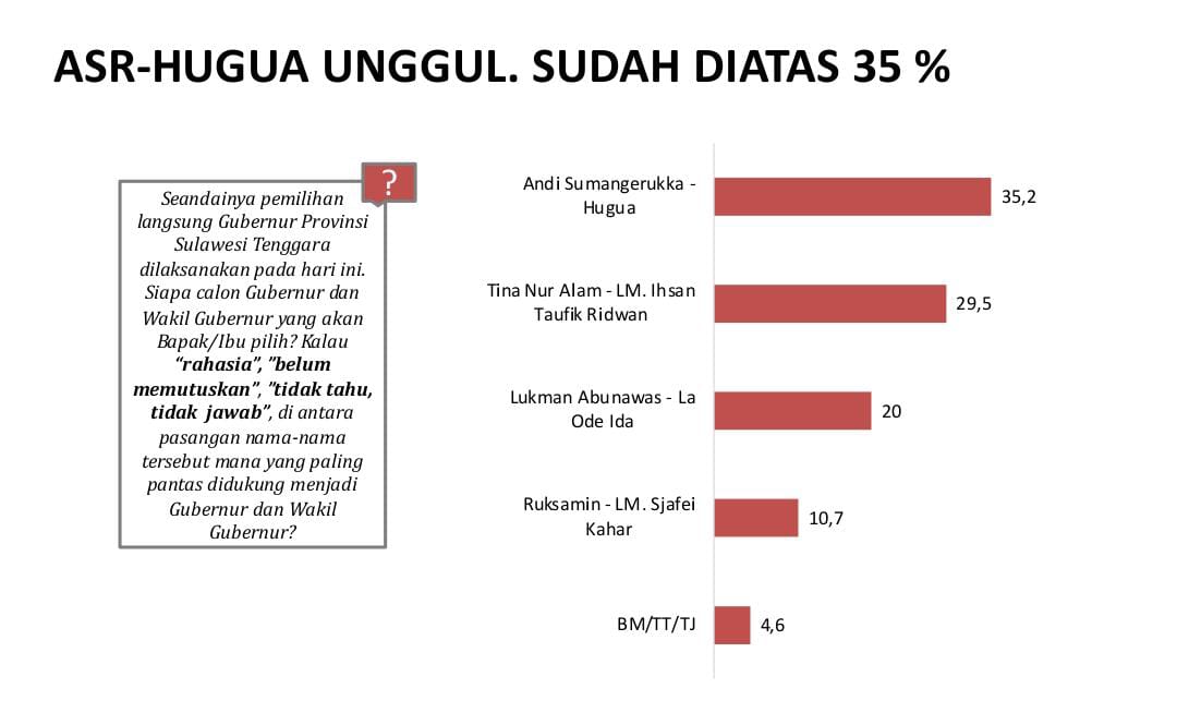 Direktur LSI Denny JA, Adjie Alfarabi menjelaskan dari hasil survei sementara paslon ASR-Hugua unggul 35,2 persen dibandingkan tiga calon lainnya. Setelah itu, pasangan Tina-Ihsan 29,5 persen, Lukman Abunawas-Laode Ida 20 persen, dan Ruksamin-Sjafei Kahar 10,7 persen. Sedangkan yang tidak menjawab sekitar 4,6 persen.