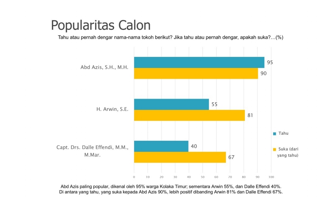 Deni menjelaskan bahwa keunggulan Abd Azis saat ini, di antaranya terkait dengan popularitasnya yang lebih tinggi dibanding calon-calon bupati lainnya. Hampir semua pemilih di Kolaka Timur tahu Abd Azis (95%), jauh di atas tingkat kedikenalan Arwin (55%) dan Dalle Effendi (40%). Di samping lebih terkenal, tingkat penerimaan terhadap Abd Azis juga lebih positif. Di antara yang tahu, yang suka kepada Abd Azis 90%, lebih tinggi dibanding Arwin 81% dan Dalle Effendi 67%