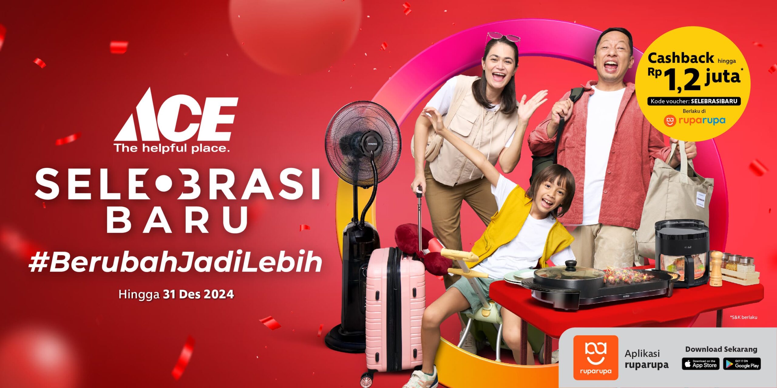Untuk itu, ia mengimbau kepada konsumen untuk tidak melewatkan penawaran spesial SELEBRASI BARU untuk #BerubahJadiLebih hingga 31 Desember 2024, di seluruh jaringan toko ACE Indonesia yang berlaku di toko maupun online di layanan omnichannel, ruparupa. Pelanggan dapat menikmati ACE LAST SALE, hemat hingga 60%, special price, cashback hingga Rp1.200.000, dan harga hemat hingga 60% untuk produk-produk Member’s Choice. Promo ini berlaku khusus bagi member ruparupa rewards. Segera daftarkan diri menjadi member ruparupa rewards dengan mengunjungi tautan berikut bit.ly/Daftar-RRR dan nikmati berbagai keuntungan lainnya.