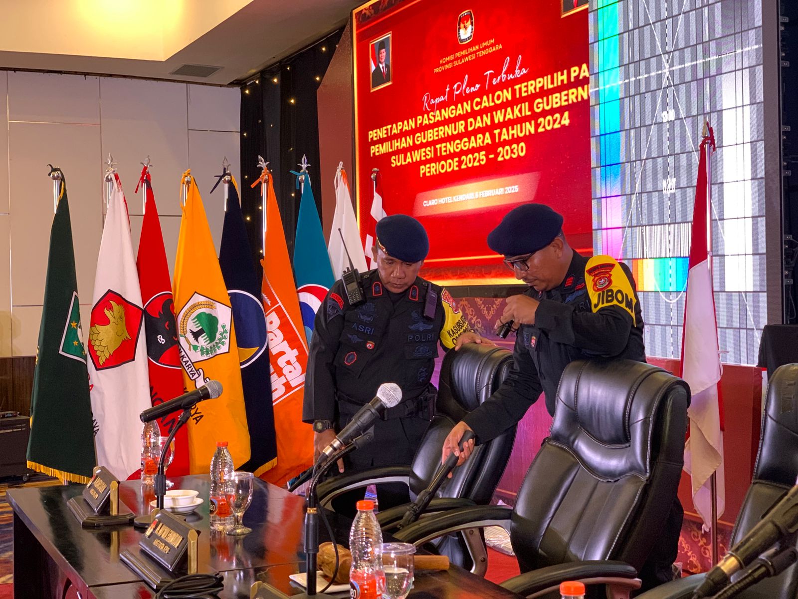 Komandan Detasemen Gegana Brimob Polda Sultra Kompol Asri Diyni mengatakan bahwa dalam sterilisasi tersebut melibatkan satu komposit. “Kami menyiapkan satu komposit atau sebanyak 16 personel yang terdiri dari Jibom, wanteror dan KBRN untuk memeriksa semua yang menjadi objek dalam ruangan ini yang meliputi meja dan kursi,” jelasnya.