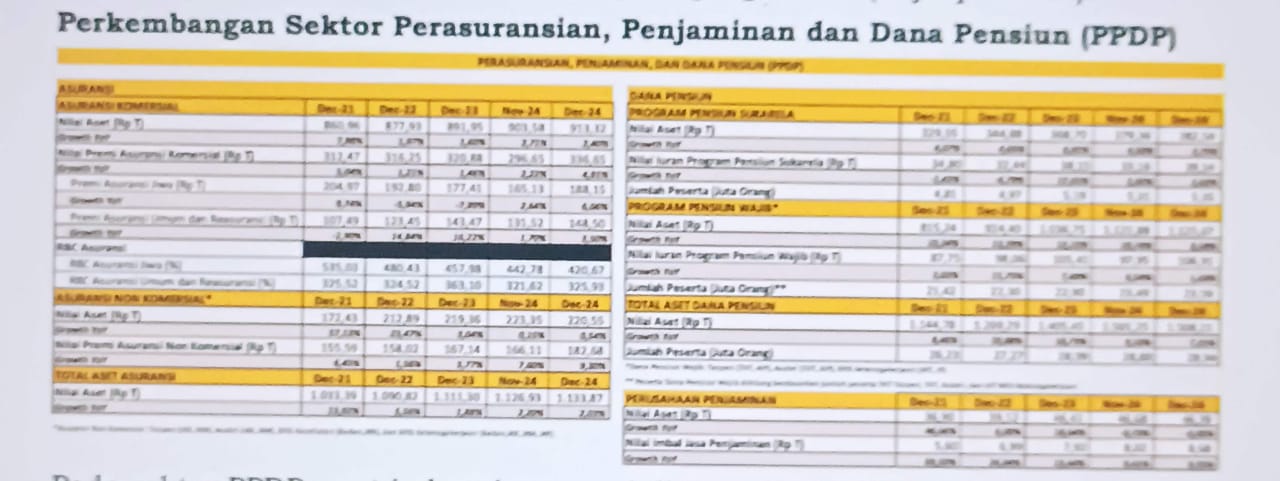 Untuk program pensiun wajib, yang terdiri dari program jaminan hari tua dan jaminan pensiun BPJS Ketenagakerjaan, serta program tabungan hari tua dan akumulasi iuran pensiun, ASN, TNI, dan POLRI, total aset mencapai Rp1.125,67 triliun atau tumbuh sebesar 8,58 persen yoy. Pada perusahaan penjaminan, pada Desember 2024 nilai aset terkontraksi 0,05 persen yoy menjadi Rp46,39 triliun.