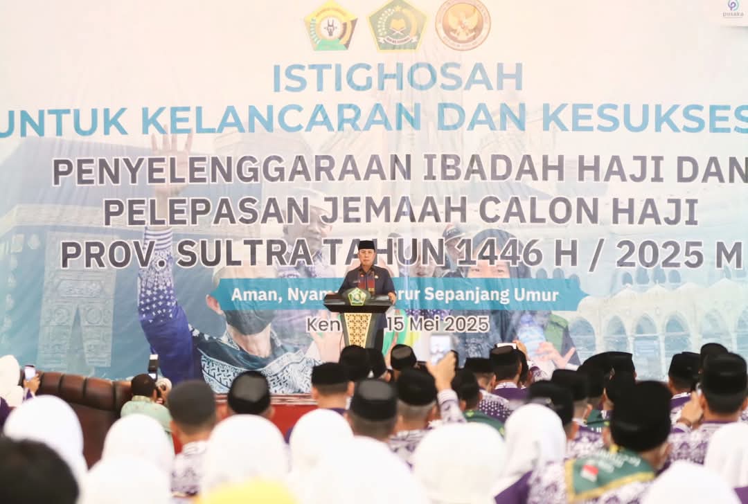 Kendari, Berikabar.co – Sebanyak 2.018 jamaah calon haji (JCH) asal Sulawesi Tenggara resmi dilepas oleh Gubernur Sulawesi Tenggara, Mayjen TNI (Purn) Andi Sumangerukka (ASR), dalam acara pelepasan yang berlangsung khidmat di Aula Asrama Haji Kendari pada Kamis, (15/5/2025). Prosesi ini dirangkaikan dengan doa bersama dan istighotsah yang dipenuhi suasana haru dan penuh rasa syukur.