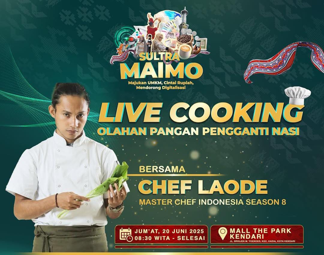Melalui unggahan resmi di akun Instagram @bank_indonesia_sultra pada Kamis, 19 Juni 2025, BI Sultra mengundang masyarakat untuk mengikuti demo memasak atau live cooking bersama Laode, finalis MasterChef Indonesia Season 8, yang akan digelar pada Jumat, 20 Juni 2025 pukul 08.30 WITA di Mall The Park Kendari.