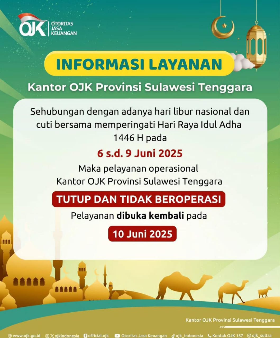 Kendari, Berikabar.co — Dalam rangka memperingati Hari Raya Iduladha 1446 Hijriah, Otoritas Jasa Keuangan (OJK) Provinsi Sulawesi Tenggara (Sultra) menyampaikan informasi kepada masyarakat bahwa pelayanan operasional kantor OJK Sultra akan ditutup sementara selama periode libur nasional dan cuti bersama.