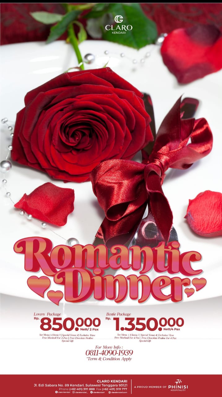 Claro Kendari yang berlokasi di Jl. Edi Sabara No. 89 Kendari, Sulawesi Tenggara, terus berkomitmen untuk memberikan pelayanan dan pengalaman terbaik bagi para tamunya melalui berbagai penawaran menarik, termasuk program Romantic Dinner ini.