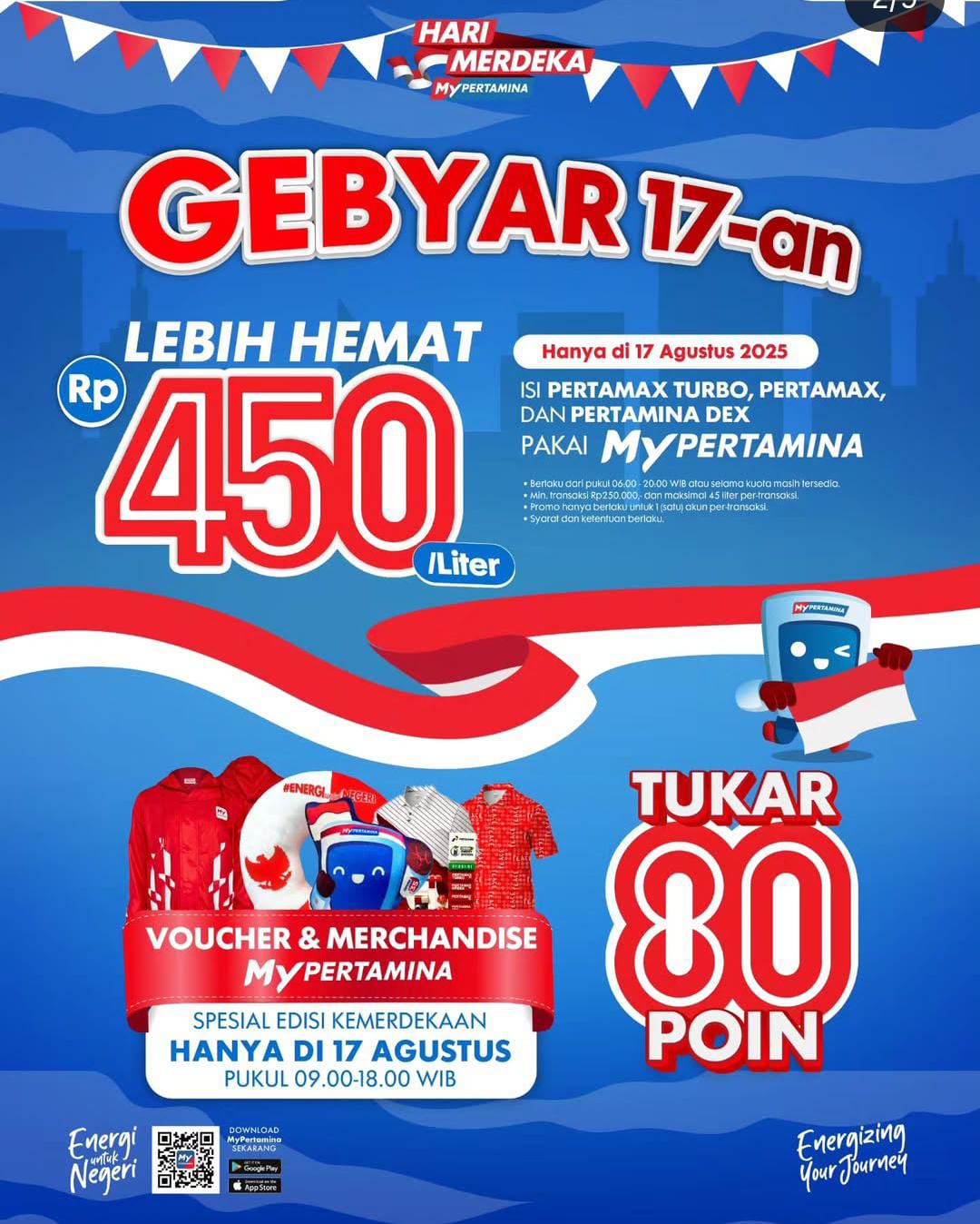 Selain diskon harga BBM, para pelanggan juga dapat menukar 80 poin dari aplikasi MyPertamina untuk mendapatkan voucher dan merchandise edisi spesial kemerdekaan.