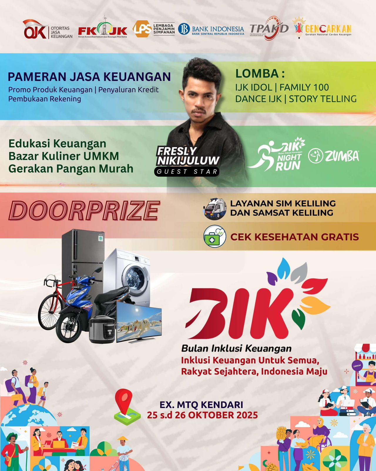 Mengangkat tema “Inklusi Keuangan untuk Semua, Rakyat Sejahtera, Indonesia Maju” ini diselenggarakan selama dua hari yakni 25 hingga 26 Oktober 2025 di Pelataran Eks MTQ Kendari. Kegiatan ini merupakan bagian dari upaya nasional untuk mempercepat inklusi keuangan dan meningkatkan literasi masyarakat.