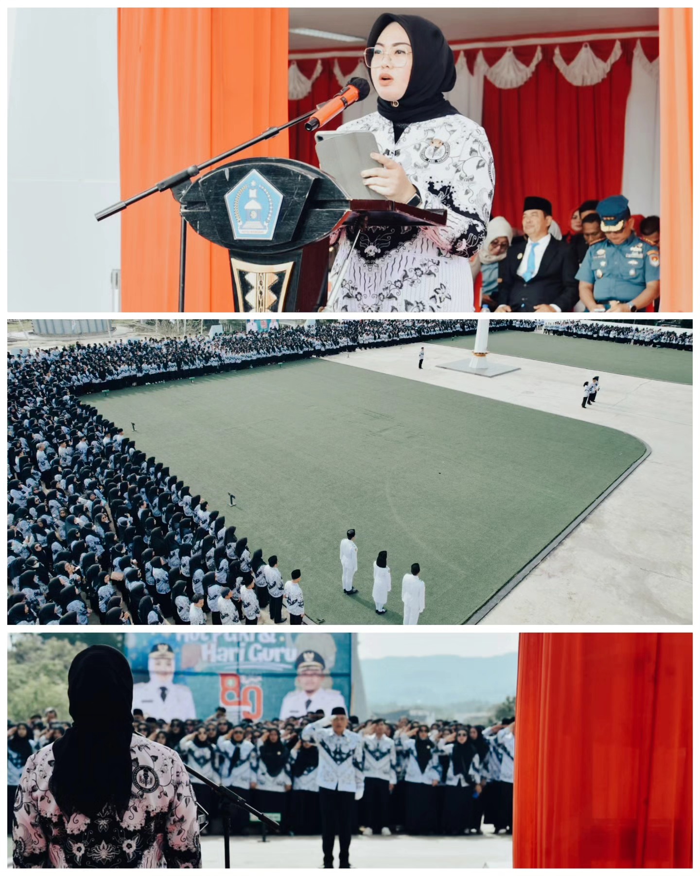 “Guru hebat mengajar dengan hati, menginspirasi tanpa henti, dan menciptakan ruang pembelajaran yang inklusif,” ujar Siska Karina Imran saat membacakan pidato Mendikdasmen.