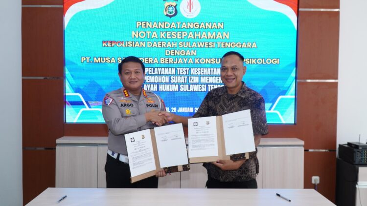 Kendari, Berikabar.co – Kepolisian Daerah Sulawesi Tenggara (Polda Sultra) resmi menjalin kerja sama strategis dengan PT Nusa Samudra Berjaya Konsultan Psikologi. Kolaborasi ini ditandai dengan penandatanganan Nota Kesepahaman (MoU) yang dilaksanakan di Aula RTMC Direktorat Lalu Lintas (Ditlantas) Polda Sultra pada Rabu (28/1/2026).
