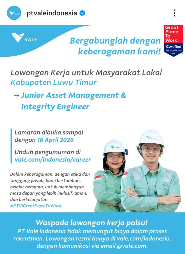 “Lamaran ditunggu hingga 18 April mendatang untuk talenta terbaik dari Kabupaten Luwu Timur,” tulis manajemen PT Vale Indonesia dalam pengumuman resminya.